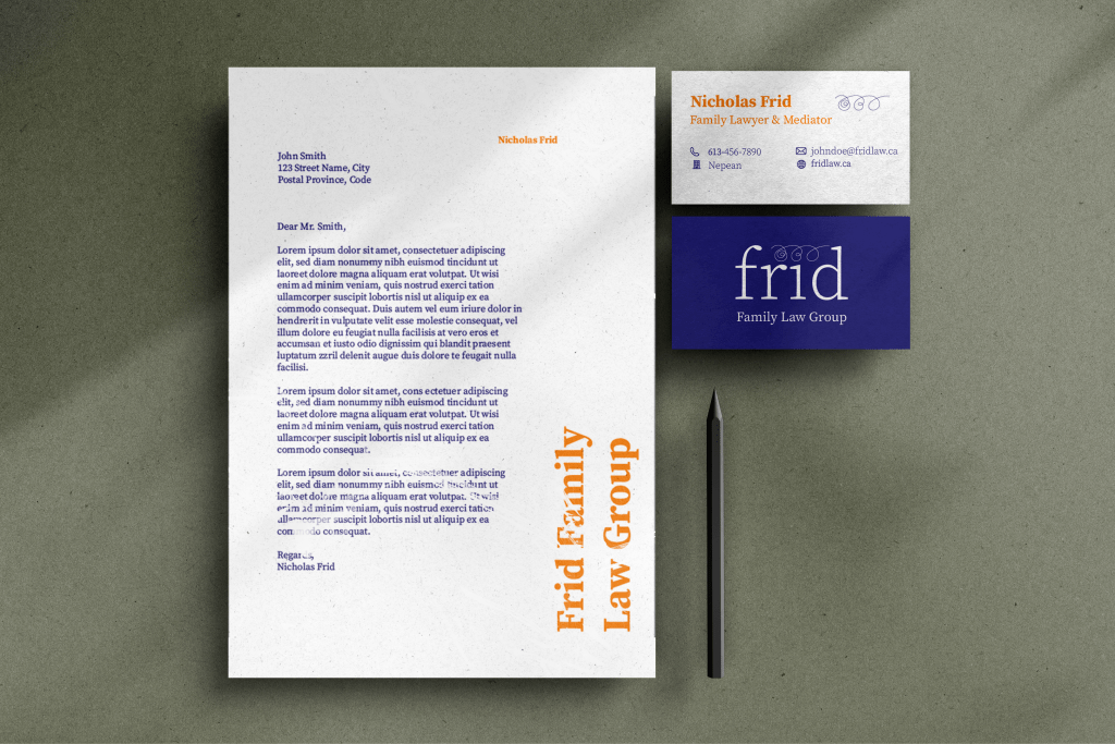 Nicholas Frid was looking for a new brand to fit his new practice, Frid Law. We developed his printed collateral such as his business cards and letterhead as well as his website to fit the new brand. Frid Law was looking to be an approachable brand, that would communicate that they are here to listen and to make the process of going through a family lawyer easier.